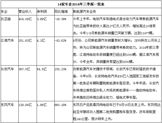 在這14家車企中,除了一汽夏利還沒有新能源汽車產(chǎn)品,其他13家車企都有各自的新能源汽車產(chǎn)品,并且比亞迪、江淮、宇通、金龍等車企的新能源汽車已經(jīng)有很好的銷量。其中,比亞迪今年1-9月新能源車銷量已突破萬(wàn)輛,達(dá)到11477輛。然而在車企的三季報(bào)中,只有比亞迪、宇通等少數(shù)車企提到了新能源汽車業(yè)務(wù),大部分車企只字未提,這說(shuō)明新能源汽車還沒有給這些車企帶來(lái)盈利。