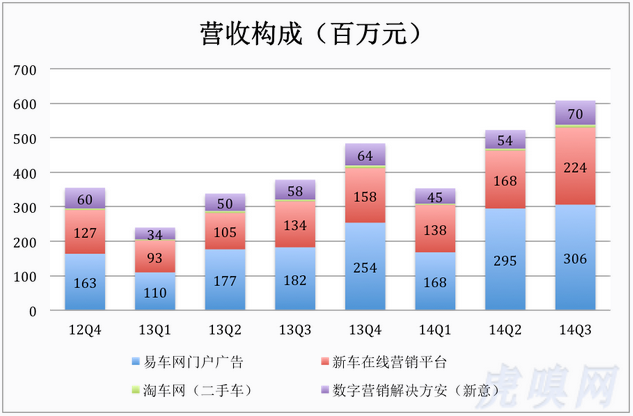 2003年成立的新意互動(dòng),是專門為汽車經(jīng)銷商提供互聯(lián)網(wǎng)營(yíng)銷服務(wù)的廣告公司,主要是幫助商家將車型、價(jià)格等信息推向各類網(wǎng)站。雖然營(yíng)收占比越來越少,但這項(xiàng)業(yè)務(wù)一頭連著客戶(經(jīng)銷商)、另一頭連著媒體(網(wǎng)站)。十多年的積累非比尋常,使易車在市場(chǎng)營(yíng)銷取得事半功倍的效果。由于相對(duì)成熟,易車對(duì)這項(xiàng)業(yè)務(wù)的市場(chǎng)營(yíng)銷費(fèi)用有限,在市場(chǎng)費(fèi)用中的占比更是一路滑落。2012年Q4,易車不到1.5億市場(chǎng)及行政費(fèi)用(易車獨(dú)特的歸類方法),新意互動(dòng)占用了3200萬。2014年Q3,市場(chǎng)及行政費(fèi)用超過3.3億,新意互動(dòng)只分配到2500萬。