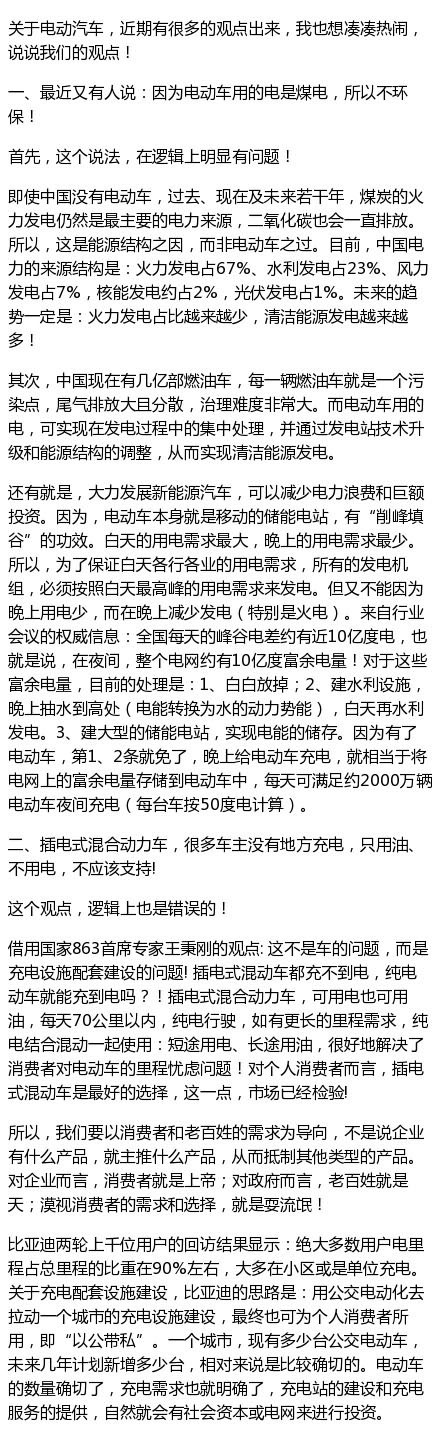 最近在新能源汽車領(lǐng)域,出現(xiàn)了不少質(zhì)疑的聲音,前有不少專家學(xué)者以及純電動汽車制造商質(zhì)疑插電混動,后有大炮任志強(qiáng)說電動汽車不環(huán)保。這些言論顯然讓比亞迪這家主打新能源概念、力推插電式混合動力汽車的車企頗感壓力。對此,比亞迪汽車銷售副總經(jīng)理李云飛表示要“湊湊熱鬧,說說我們的觀點(diǎn)”,他發(fā)了一條長微博,對“電動汽車是否環(huán)保”、“該不該支持插電混動車”、“電動汽車的續(xù)航及電池壽命”、“電磁輻射”這四大質(zhì)疑做出了回應(yīng)。