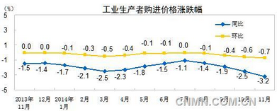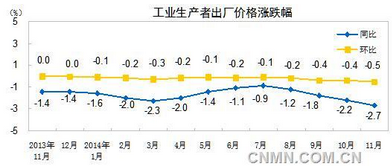 2014年11月份,全國工業(yè)生產(chǎn)者出廠價格同比下降2.7%,環(huán)比下降0.5%。工業(yè)生產(chǎn)者購進價格同比下降3.2%,環(huán)比下降0.7%。1-11月平均,工業(yè)生產(chǎn)者出廠價格同比下降1.8%,工業(yè)生產(chǎn)者購進價格同比下降2.0%。