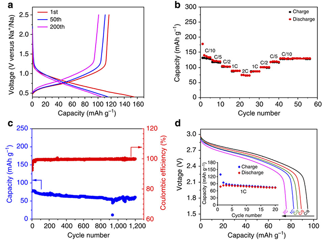 (c)2C倍率下的長循環(huán)性能,(d)Na3V2(PO4)3/C//Na0.66[Li0.22Ti0.78]O2全電池電化學(xué)性能