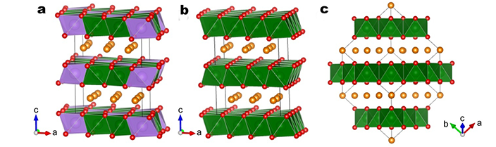 圖1 計算模型:(a) P2-Na[Li0.33Ti0.67]O2,(b) P2-NaTiO2,(c) O3-NaTiO2。橙色、紫色、綠色和紅色分別代表鈉、鋰、鈦和氧