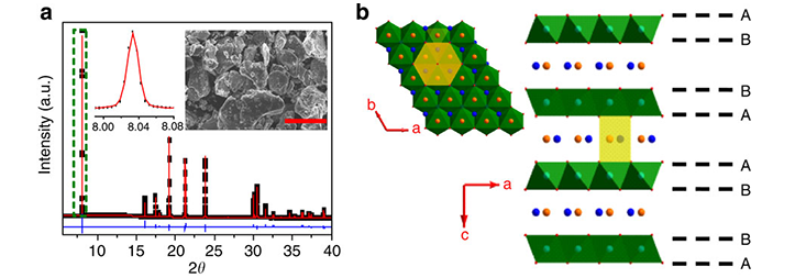 圖3 P2-Na0.66[Li0.22Ti0.78]O2材料的形貌及結(jié)構(gòu)圖:(a) XRD圖譜及形貌,(b)樣品的結(jié)構(gòu)圖