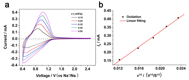 圖8 Na+離子表觀擴(kuò)散系數(shù)測量:(a)不同掃描速度的CV曲線,(b)氧化峰電流與掃描速度(v1/2)的關(guān)系