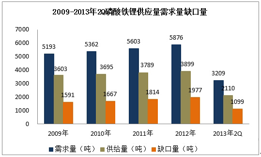 圖表4:2009-2013年2Q磷酸鐵鋰供應(yīng)量需求量缺口量
