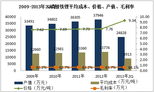 圖表6:2009-2013年2Q磷酸鐵鋰平均成本、價格、產(chǎn)值、毛利率