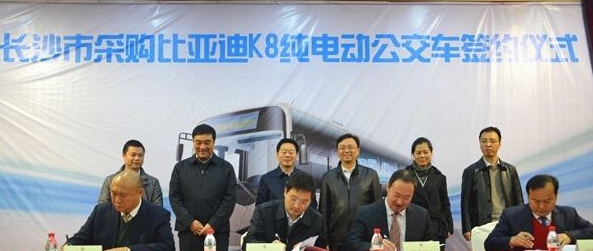 比亞迪公司商用車銷售事業(yè)部總經(jīng)理王杰分別與湖南巴士公共交通有限公司、湖南龍驤巴士有限責任公司、長沙寶駿巴士有限公司就采購400輛比亞迪K8純電動公交車正式簽約。