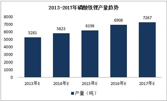 圖表2:2013-2017年磷酸鐵鋰產(chǎn)量趨勢