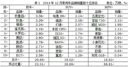 12月,乘用車(chē)共銷(xiāo)售206.11萬(wàn)輛,環(huán)比增長(zhǎng)16.09%,同比增長(zhǎng)15.99%,市場(chǎng)表現(xiàn)明顯好于上月,當(dāng)月銷(xiāo)量首次超過(guò)200萬(wàn)輛,月度環(huán)比和同比均呈較快增長(zhǎng);中國(guó)品牌市場(chǎng)占有率繼續(xù)保持小幅回升。2014年,乘用車(chē)銷(xiāo)量接近2000萬(wàn)輛,同比增速接近10%,增幅較上年有所減緩。2014年,乘用車(chē)共銷(xiāo)售1970.06萬(wàn)輛,同比增長(zhǎng)9.89%。