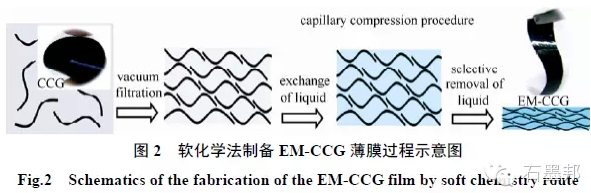 本文作者課題組楊曉偉等利用化學轉化石墨烯在水溶液中的高分散性,采用過濾的方法在濾膜和溶液界面可控制備了石墨烯片層定向分布的化學轉換石墨烯水凝膠(chemically convertedgraphene,CCG),獲得了石墨烯片層之間π—π 吸引力和溶劑化的排斥力之間的平衡點,具有良好的力學強度,可以直接作為超級電容器的電極應用。在此基礎上,為了確保實際應用中石墨烯電極內部的片層網絡結構,采用毛細管壓縮過程(capillarycompression procedure),以CCG 為前驅體,先通過真空過濾形成CCG 膜,再將CCG 膜浸潤在不同比例的揮發(fā)性/非揮發(fā)性物質混合溶液中,通過毛細壓縮作用,非揮發(fā)性物質、硫酸或離子液體(EMIMBF4)與水置換進入石墨烯片層間形成液體介導的致密性石墨烯基薄膜(如EM-CCG)(圖2)。