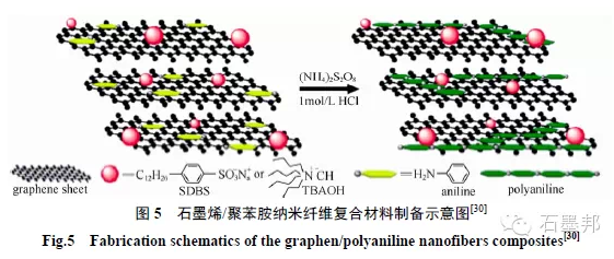 在0.3 A/g 電流密度下,其比容量達到400 F/g。Mao等在含有四丁基氫氧化銨或十二烷基苯磺酸鈉作為表面活性劑的溶液中原位聚合合成了石墨烯/聚苯胺納米纖維復合材料(圖5),在2 mol/L 的H2SO4 水溶液電解液中以0.2 A/g 電流密度充放電下,其最大比容量達526 F/g。