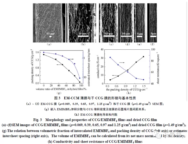 由于進入石墨烯片層的離子液體與水/離子液體混合比例有關,不同EMIMBF4 體積比將形成堆積密度和石墨烯片層間距不同的EM-CCG 薄膜,其電導率及內阻也不相同,所制備EM-CCG 薄膜基本形貌與性質如圖3 所示。