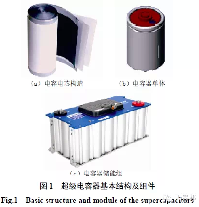超級電容器是介于傳統電容器和二次電池之間的一種電化學儲能裝置,其容量可達幾百甚至上千法拉。自1975 年Conway 首次提出法拉第準電容的儲能原理以來,超級電容器的研發(fā)已經得到了長足的發(fā)展,日本NEC、松下、本田、日立和美國Maxell 等公司開發(fā)出的小型超級電容器已開始推向市場,在小型移動電子設備、汽車能量回收等領域應用。法國SAFT 公司、韓國NESE 公司等也在進行超級電容器的研究和開發(fā)。美國的USMSC計劃、日本的New Sunshine 計劃和歐洲的PNGU計劃均將超級電容器列入開發(fā)內容。我國將“超級電容器關鍵材料的研究和制備技術”列入到《國家中長期科學和技術發(fā)展綱要(2006—2020 年)》,作為能源領域中的前沿技術之一。超級電容器作為一種新型電化學儲能單元,具有容量大、功率密度高、免維護、對環(huán)境無污染、循環(huán)壽命長、使用溫度范圍寬等優(yōu)點,已在備用電源系統、便攜式電子設備和電動汽車領域有廣泛的應用。對于具有隨機性和間歇性等特點的可再生能源發(fā)電,超級電容器應用于風力發(fā)電中可以提高風電場的運行安全。超級電容器的基本構造與應用組件如圖1 所示。
