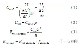 式中,felectrode 為兩個電極與超級電容器組的體積比。由此可見,評價石墨烯電極材料的優(yōu)劣不僅僅是看其質量比電容,還與其電極體積比能量、電解液、充放電流密度等參數密切相關。