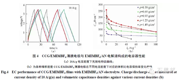 我們采用所制備的EM-CCG 薄膜作為對稱電極,以EMIMBF4/AN 為電解液,由于在電極和電解液中均存在EMIMBF4 體,有效地解決了電極/電解液界面?zhèn)鬏斪枇?,形成高的電導率和連續(xù)的離子傳遞網絡,同時解決了石墨烯電極材料與電解液的浸潤性問題。所組成的超級電容器開路電壓達到3.5 V,其最大能量密度達到60 W·h/L,經過300 h恒電壓循環(huán)比電容保持率超過95%,循環(huán)性能優(yōu)異。該研究為石墨烯基電極材料及電容系統制備過程放大奠定了良好的基礎,相關結果在美國Science雜志上發(fā)表。各種堆積密CCG/EMIMBF4 薄膜電極在不同電流密度下對應的體積比電容保持率變化曲線及充放電特征曲線如圖4 所示。