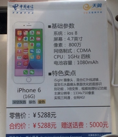 還記得之前那部移動定制版iPhone 6 Plus嗎?它運(yùn)行的居然是“Android”系統(tǒng),笑掉了一地大牙?,F(xiàn)在,電信業(yè)不甘示弱來了這么一出。網(wǎng)友@Hito先生丶今天在電信營業(yè)廳發(fā)現(xiàn)了一部奇怪的iPhone 6,電信把它的處理器標(biāo)注四核心1GHz,網(wǎng)絡(luò)制式則只有CDMA,電池容量甚至才1080mAh。