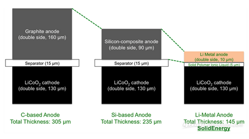 SolidEnergy研發(fā)的這款原型電池由陰極,SPIL電解質(zhì)和固態(tài)聚合物包裹的鋰金屬陽極組成。同時,這款創(chuàng)新的SPIL電解質(zhì)由液態(tài)離子和液態(tài)聚合物構(gòu)成,它強大的溫控能力能夠為電池的正常工作提供安全、范圍較廣的環(huán)境溫度;此外,被固態(tài)聚合物包裹的金屬鋰作為陽極,能夠提高電池的能量密度和循環(huán)使用次數(shù),電解液中的抑制鋰枝晶產(chǎn)生的添加劑同樣能夠提高該電池的安全性。