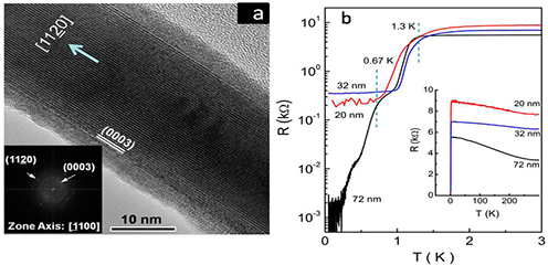 (左)鉍納米線的高分辨電鏡照片;(右)不同直徑Bi納米線電阻隨溫度變化曲線