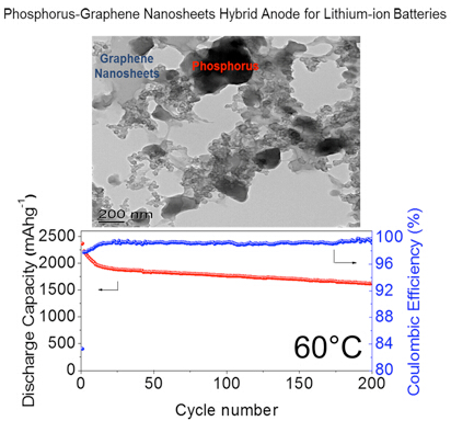 針對這一問題,最近美國賓夕法尼亞州立大學(The Pennsylvania State University)王東海教授領導的,以于昭新、宋江選為主的科研梯隊發(fā)明了一種新型鋰離子電池負極材料:“紅磷-石墨烯”納米復合材料。該種材料是由紅磷和石墨經球磨制備得到。紅磷化學穩(wěn)定性高,廉價易得,而且環(huán)境友好。其作為鋰離子電池負極材料的理論容量可達2600 mAh/g,7倍于商用石墨電極。 石墨/石墨烯因其極高的電子電導率被引入到該體系中以提升納米復合材料整體的電子電導率。在高速球磨過程中,微米級的紅磷顆粒被打碎至納米級。石墨在球磨 過程中剝離為大比表面積的石墨烯。經過長時間機械力作用,石墨烯相互搭接形成一個緊密結合的三維導電網絡,而納米級紅磷顆粒均勻分散在該網絡中。紅外光譜 (Infrared Spectroscopy)測試顯示,紅磷和石墨烯以“磷-氧-碳 (P-O-C)”的化學鍵形式結合在一起,這又為該材料出眾的電池性能提供了保證。在室溫下,該納米復合材料的放電容量可達1400mAh/g, 4倍于現(xiàn)行商用化鋰離子電池負極材料–石墨。 經過300周的循環(huán),放電容量仍然能保持在60%以上。高溫環(huán)境(60°C)對于現(xiàn)行商用鋰離子電池仍是很大的挑戰(zhàn)。而該種材料,在60°C下,放電容量 可進一步提升至1650mAh/g。經過200周循環(huán),放電容量保持率可在70%以上。