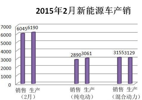 近日中國汽車工業(yè)協(xié)會(huì)公布新能源汽車2月產(chǎn)銷統(tǒng)計(jì)。2015年2月新能源汽車生產(chǎn)6190輛,銷售6045輛。其中純電動(dòng)汽車產(chǎn)銷分別完成3061輛和2890輛,同比分別增長2.8倍和4倍;插電式混合動(dòng)力汽車產(chǎn)銷分別完成3129輛和3155輛,同比分別增長2.7倍和2.4倍。
