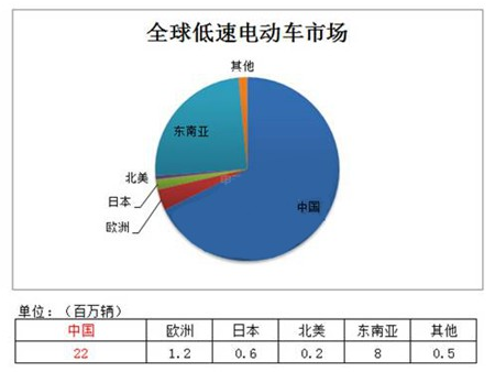 低速電動車涵蓋了電動自行車、電動摩托車、電動三輪車、低速電動汽車等。下圖表明,中國的低速電動車市場是巨大的,超出歐洲、日本、南美、東南亞等市場很多倍。
