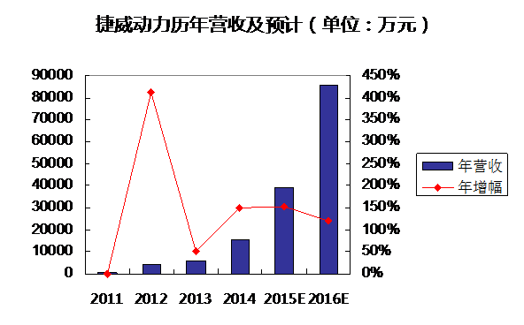 雖然捷威動力在成立之初希望專注于動力鋰離子電池業(yè)務,但出于生存的需要,公司現(xiàn)階段還是以3C小電池業(yè)務為主,不過,隨著新能源汽車市場的爆發(fā),本年度汽車動力電池將首次成長為公司最大的收入來源。捷威動力2011年實現(xiàn)796萬元的營收,2014年快速增長到了1.53億元,是2011年的19倍多。公司計劃2015年要實現(xiàn)3.88億元的營收,同比增長150%以上。