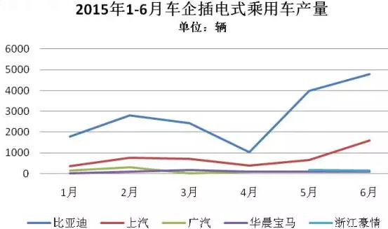 生產(chǎn)插電式乘用車的車企有五家,分別是比亞迪、上汽、廣汽、華晨寶馬、沃爾沃。比亞迪一直是插電式乘用車產(chǎn)銷的龍頭企業(yè),占比達73.8%,與其他四家企業(yè)拉開了不小的差距。上汽插電式乘用車的1-4月產(chǎn)量趨勢比較平穩(wěn),5月、6月迎來大幅增長,與其調(diào)整產(chǎn)能、推進新能源汽車入駐大型國企有很大關(guān)系。