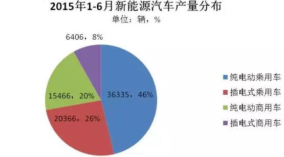 從車型分布來看,純電動乘用車仍是整個新能源汽車市場的主力車型,2015年上半年生產(chǎn)36355輛,占總體產(chǎn)量的45%。其次是插電式乘用車生產(chǎn)20366輛,占比26%。新能源乘用車整體占比由去年的65%提升了7個百分點,私人市場進一步擴大。
