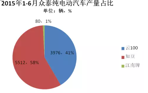 眾泰2015年1-6月生產(chǎn)電動汽車9568輛。旗下主推的車型有眾泰知豆和云100,另外以江南奧拓為原型打造的電動汽車也開始生產(chǎn)。