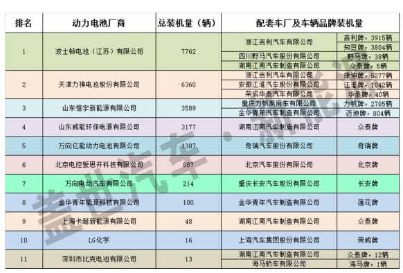 山東威能環(huán)保電源公司排在第四名,主要為湖南江南汽車制造公司生產(chǎn)的眾泰牌電動(dòng)車配套,當(dāng)月裝機(jī)量為3177輛。