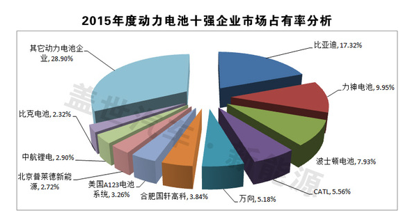 由圖表可以看出,此10家動力電池企業(yè)的裝機量總和為228571輛,占據(jù)2015年度新年能源汽車61.1%的市場份額。