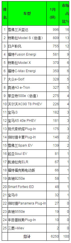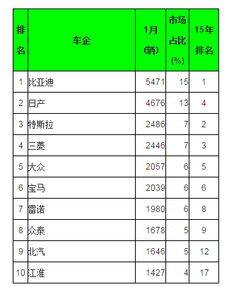 像往常一樣,特斯拉Modle S和三菱歐藍(lán)德PHEV重新開(kāi)始了第三的爭(zhēng)奪戰(zhàn),1月份后者勝出。在前十名中,還有另外三款車(chē)型來(lái)自中國(guó):北汽E系列EV、江淮iEV系列和上汽榮威550 PHEV。中國(guó)汽車(chē)制造商目前在電動(dòng)汽車(chē)市場(chǎng)的份額已經(jīng)達(dá)到了35%。