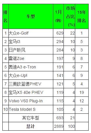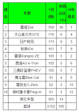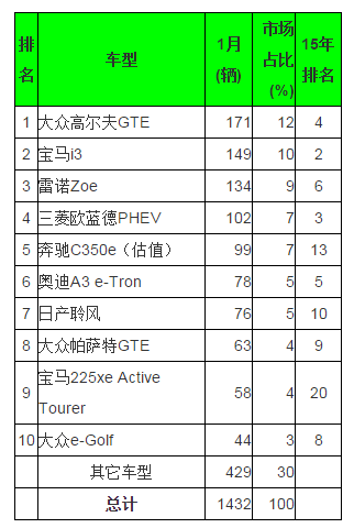 像去年一樣,大眾高爾夫GTE開(kāi)年排在首位,售出171輛,其次是寶馬i3和雷諾Zoe,分別賣(mài)出149輛和134輛。