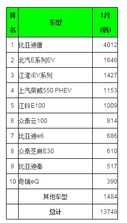 車(chē)型銷(xiāo)量排行方面,比亞迪唐SUV已經(jīng)高高在上,仿佛沒(méi)有了競(jìng)爭(zhēng)對(duì)手,銷(xiāo)量幾乎是排在第二位的北汽E系列EV的近三倍。但是北汽E系列EV的成績(jī)并不差,銷(xiāo)量同比增加9倍。其他車(chē)型的銷(xiāo)量也在上漲,江淮iEV一月銷(xiāo)售1427輛,一年前的那個(gè)時(shí)候,只有200輛...
