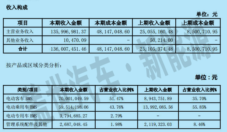從營(yíng)業(yè)貢獻(xiàn)來(lái)看,電動(dòng)客車 BMS 營(yíng)業(yè)收入超過(guò)7000萬(wàn)元,占比從 35.7%上升至 51.47%;電動(dòng)乘用車 BMS 本期營(yíng)收超過(guò)5951萬(wàn)元,較上期有較大增長(zhǎng),但占營(yíng)業(yè)收入比由上期的 55.85%下降至 43.76%;報(bào)告期內(nèi),公司產(chǎn)品開(kāi)始運(yùn)用在物流車、環(huán)衛(wèi)車等專用車領(lǐng)域,故報(bào)告期內(nèi)新增電動(dòng)專用車 BMS 產(chǎn)品類別,本期營(yíng)收超過(guò)379萬(wàn)元,占營(yíng)業(yè)收入比例為 2.79%。