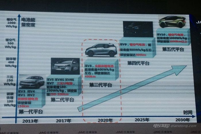 江淮也將在今后的發(fā)展中繼續(xù)推進純電動汽車平臺建設(shè),具體規(guī)劃是:到2020年打造出第三代純電動汽車研發(fā)、生產(chǎn)平臺,推出使用全固體鋰電池,續(xù)航里程達到400公里的的iEV8車型,到2025年,打造出第四代平臺,推出使用鋰空氣電池,續(xù)航里程達到500公里的iEV9車型,而達到2030年,江淮會推出第五代電動汽車平臺,使用鋰空氣電池的iEV10車型將擁有1000公里的續(xù)航里程,完全超越燃油車。