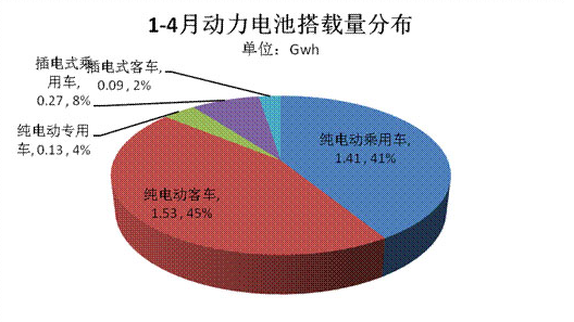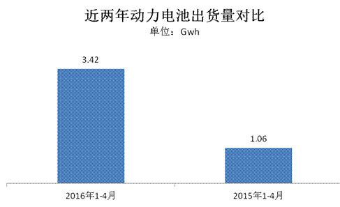 源于政策紅利的引導(dǎo)輔以私人消費(fèi)信心的培育以及充電基礎(chǔ)設(shè)施等多方面的發(fā)展,新能源汽車(chē)市場(chǎng)也逐步走向穩(wěn)增長(zhǎng)。據(jù)中汽協(xié)數(shù)據(jù)統(tǒng)計(jì),2016年1-4月新能源汽車(chē)產(chǎn)量94442輛,比上年同期增長(zhǎng)126.8%。而作為核心零部件的動(dòng)力電池也跟隨新能源汽車(chē)整體市場(chǎng)走向,呈現(xiàn)高增長(zhǎng)趨勢(shì)。據(jù)第一電動(dòng)研究院數(shù)據(jù)梳理,2016年1-4月動(dòng)力電池出貨量達(dá)3.42Gwh,較之去年同期1.06wh的出貨量實(shí)現(xiàn)同比增長(zhǎng)2.38倍。(注釋?zhuān)阂韵聞?dòng)力電池?cái)?shù)據(jù)源于新能源汽車(chē)產(chǎn)量與其搭載的電池容量乘積。由于未考慮其他影響因素,總體實(shí)際產(chǎn)能會(huì)略高于此。電池出貨量計(jì)算公式:車(chē)型搭載電池容量*車(chē)型產(chǎn)量。