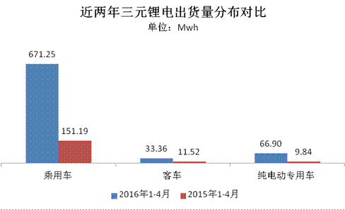 三元鋰電池方面,此前政策要求暫停三元鋰電應(yīng)用于客車(chē)領(lǐng)域,但從今年與去年同期出貨量數(shù)據(jù)比較看,這對(duì)三元鋰電的總產(chǎn)能并未造成太大影響,與2015年1-4月三元鋰電池出貨量(172.55Mwh)對(duì)比,今年實(shí)現(xiàn)了3.47倍的同比增幅,凈增量達(dá)600Mwh。細(xì)分看,三元鋰電在客車(chē)領(lǐng)域的變化基本不達(dá),僅增21Mwh左右;對(duì)應(yīng)的其產(chǎn)能在乘用車(chē)領(lǐng)域的增幅最為明顯,同比增幅達(dá)3.44倍,凈增量達(dá)520Mwh;其次,三元鋰電在專(zhuān)用車(chē)領(lǐng)域的變化也伴隨專(zhuān)用車(chē)產(chǎn)量的走勢(shì)逐步遞增,電池搭載量增量達(dá)57Mwh,增幅達(dá)5.7倍。