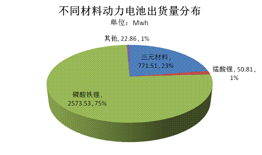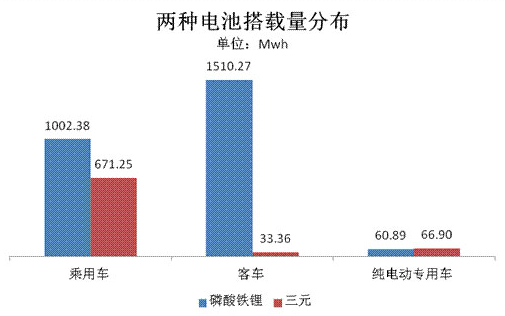 目前電池類(lèi)型主要為磷酸鐵鋰和三元材料,兩者累計(jì)出貨量達(dá)3.34Gwh,占比總量的97.66%。對(duì)比兩種電池材料的應(yīng)用領(lǐng)域看,兩者在乘用車(chē)、客車(chē)、專(zhuān)用車(chē)領(lǐng)域均有分布,但磷酸鐵鋰電池主要集中應(yīng)用于客車(chē)、乘用車(chē)領(lǐng)域,兩部分電池出貨量分布為1.5Gwh 和1Gwh,均超過(guò)1Gwh,占比磷酸鐵鋰電池總量(2.57Gwh)的97%;而三元材料電池受制于政府此前暫停三元鋰電池客車(chē)列入新能源汽車(chē)推廣應(yīng)用推薦車(chē)型目錄,使得該類(lèi)型電池主要集中應(yīng)用于乘用車(chē)領(lǐng)域。