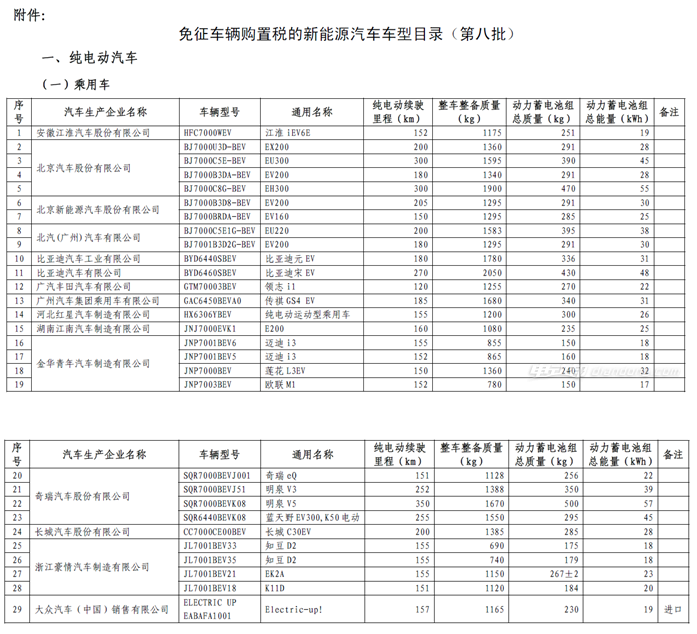 6月16日,工信部發(fā)布第八批《免征車輛購置稅的新能源汽車車型目錄》,此次共414款新能源車型進(jìn)入目錄,其中純電動(dòng)乘用車29款,電式混合動(dòng)力乘用車10款,其余車型為395款車型為商用車與專用車。