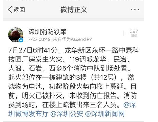 據(jù)龍華新區(qū)管委會消息,7月27日6時41分,龍華新區(qū)東環(huán)一路中泰科技園發(fā)生火災(zāi)。事發(fā)后,新區(qū)相關(guān)領(lǐng)導(dǎo)立即到場指揮處置,消防官兵快速趕赴現(xiàn)場滅火。8時許,火勢得到控制。