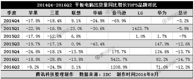 從IDC發(fā)布的2016年第二季度的數(shù)據(jù)來看,平板電腦出貨量降至3870萬臺(tái),較去年同期下滑了12.3%,而這已經(jīng)是全球平板電腦市場(chǎng)連續(xù)第7個(gè)季度的同比下滑了。