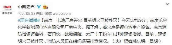 昨日5時09分,南京樂金(LG)化學(xué)新能源電池有限公司廠房失火。據(jù)了解,著火點是鋰電池生產(chǎn)設(shè)備。南京消防增調(diào)邁皋橋、石門坎、戰(zhàn)勤保障、大廠(干粉車)趕赴現(xiàn)場增援。目前,現(xiàn)場明火已被撲滅,消防人員正在組織逐層排查情況。