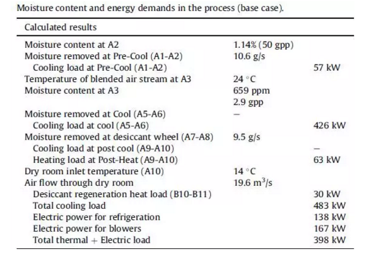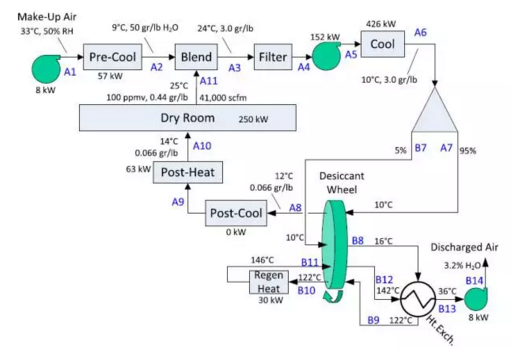 干燥間前端使用的氣體為33℃,相對(duì)濕度為50%或2.5vol%的空氣,首先這部分空氣被降溫到9℃,以便去除其中的水分,然后這部分干燥氣體,將會(huì)與干燥間排出的氣體進(jìn)行混合,混合后的氣體溫度為24℃,濕度為0.07vol%,混合氣體會(huì)被再次降溫到10℃,然后混合氣體大部分(95%)會(huì)被送回到干燥間內(nèi),一小部分(5%)會(huì)被當(dāng)作清洗氣流最終離開(kāi)系統(tǒng),最終干燥間內(nèi)部的濕度控制在15ppm左右,溫度控制在25℃。清洗流量低(5%)是該系統(tǒng)最大的優(yōu)點(diǎn),這可以顯著的減少氣體降溫和加熱耗能。