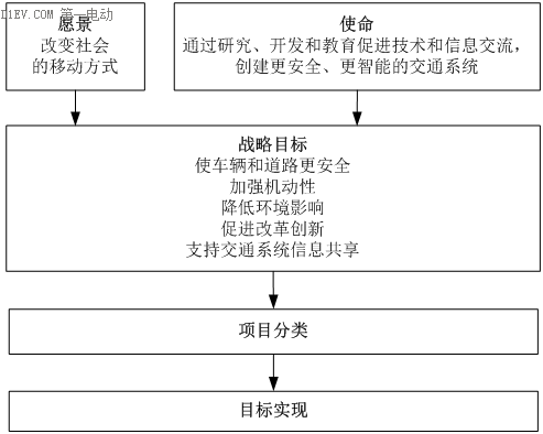 美國ITS戰(zhàn)略計(jì)劃藍(lán)圖的愿景是“改變社會(huì)的移動(dòng)方式”,使命是“通過研究、開發(fā)和教育活動(dòng)促進(jìn)技術(shù)和信息的交流,創(chuàng)建更安全、更智能的交通系統(tǒng)”,旨在發(fā)現(xiàn)通往建設(shè)智能交通系統(tǒng)的途徑,同時(shí)形成一個(gè)新的工業(yè)形式和經(jīng)濟(jì)增長(zhǎng)點(diǎn)。