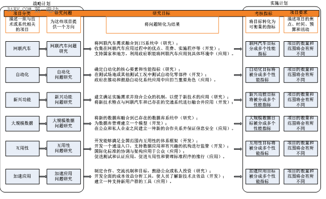在上述目標(biāo)要求下,該戰(zhàn)略計(jì)劃聚焦于兩大發(fā)展主題:實(shí)現(xiàn)網(wǎng)聯(lián)汽車,將近年來的設(shè)計(jì),測(cè)試和計(jì)劃用于網(wǎng)聯(lián)汽車進(jìn)入實(shí)質(zhì)性進(jìn)展階段,并在全國范圍內(nèi)普及;推進(jìn)自動(dòng)化駕駛,采用自動(dòng)化相關(guān)技術(shù)研究推進(jìn)車輛的自動(dòng)駕駛與無人駕駛。這兩大發(fā)展主題也重點(diǎn)反映了近年來大多數(shù)交通研究機(jī)構(gòu)的研究和創(chuàng)新的方向。