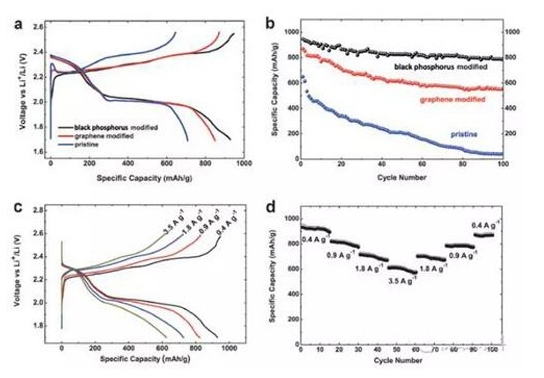 黑磷改性后的隔膜用于鋰硫電池中,100圈循環(huán)后容量保持率為86%,而石墨烯改性后的隔膜對(duì)應(yīng)的電池的容量保持率僅為66%。黑磷的應(yīng)用為提高鋰硫電池的性能打開了新的大門。