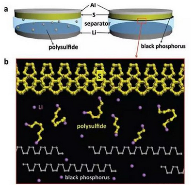 雖然碳材料可以限制鋰硫電池中多硫化物的擴(kuò)散,但由于碳材料對(duì)多硫化物的吸附作用較弱,所以這限制了碳材料作為固硫材料的應(yīng)用??紤]到這一不足,崔屹課題組將黑磷納米片沉積在商用聚丙烯隔膜的表面,以通過物理吸附和化學(xué)鍵合的方式增強(qiáng)隔膜對(duì)多硫化物的阻礙作用。