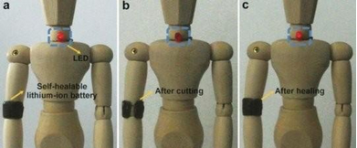 開發(fā)這項技術(shù)的研究團隊,利用佩戴在玩偶手臂上的柔性腕帶形狀電池進行了演示。電池受到損傷后,會自己“長好”,恢復供電,就像沒有受到過損傷一樣。