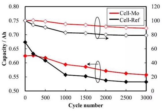 實(shí)驗(yàn)中Naoki Kimura以L(fǎng)iOH,NiO,Co3O4,MnO2和MoO3為原料,利用高溫固相法合成了NCM622材料,正負(fù)極材料分別制成極片后,組裝成為方形疊片電池,電解液采用EC和DEC體系,并添加少量VC和PS。在2C的倍率下循環(huán)3000次,SOC范圍25%-75%,每500次測(cè)量一次全容量(0.5C,2.5-4.2V)。